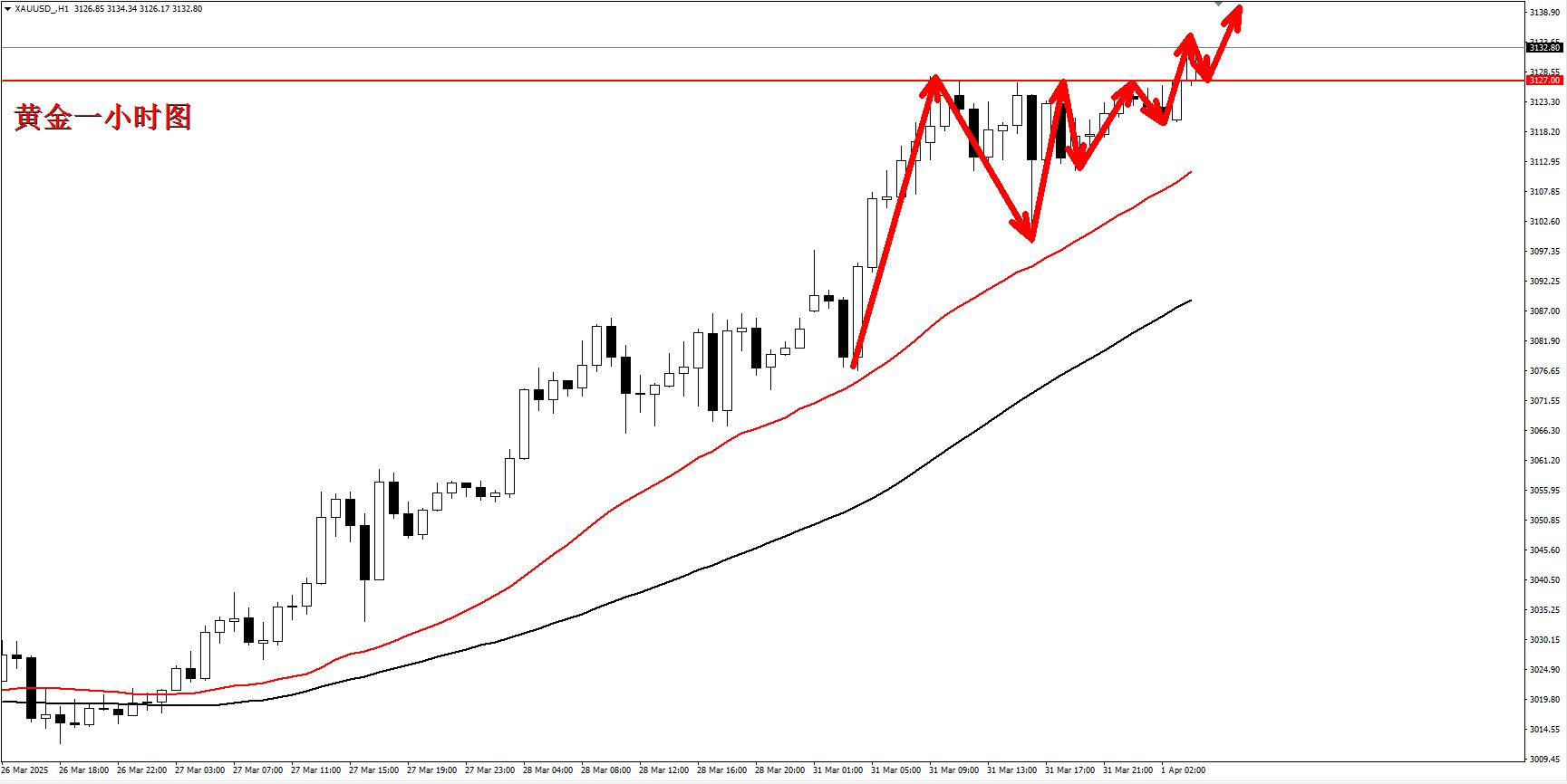 那对于我们日内黄金投资我认为还是继续保持看多,因为大方向来看,黄金已经完全突破站稳3000关口之上,一季度走势呈现超出强势上涨的态势,并且市场还不断攻击上方更高的点位,从一小时盘面上看,黄金早盘直接突破新高延续涨势,而盘中3127一线已经转为支撑位,若早盘再次回踩3127一线我们直接多!