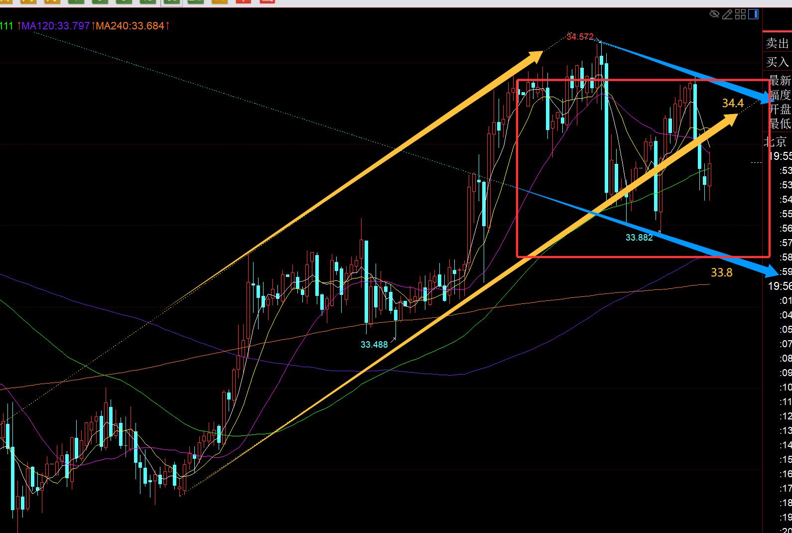 白银方面:白银近期走势规律就是一个区间盘整+强势连阳破高+区间盘整,由于上图中,上行通道有所失守,日线级别可能又要步入一定箱体区间内运行整理,支撑33.8-33.7,阻力34.4-34.6,区间内运行看待;
