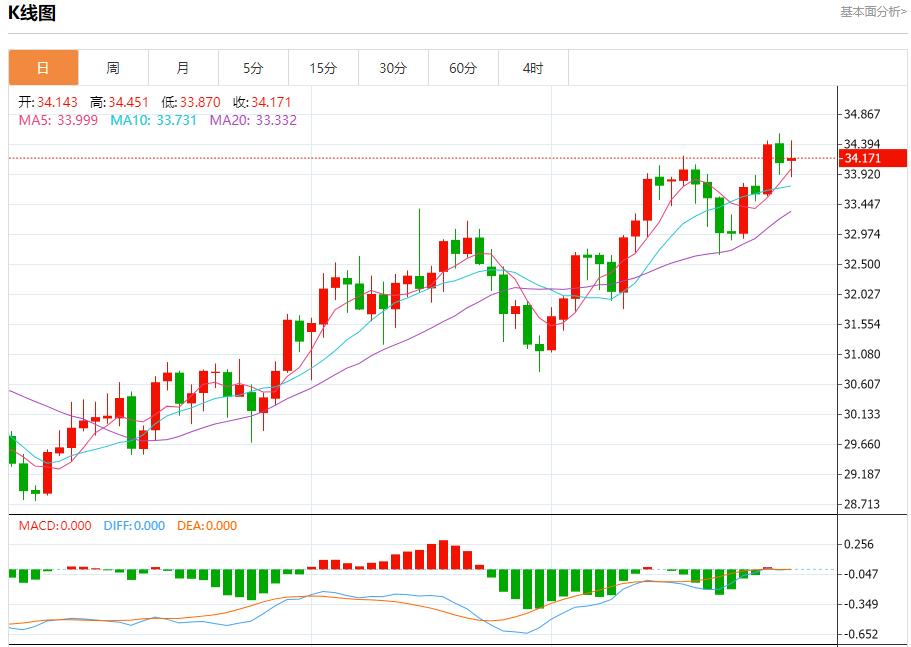 现货白银:截止北京时间20:26,现货白银上涨,现报34.179,涨幅0.21%。纽市盘前,银价在最近的盘中交易中下跌,同时寻求底部以帮助其积聚动力和反弹,因此依赖于34.00美元的重要支撑。