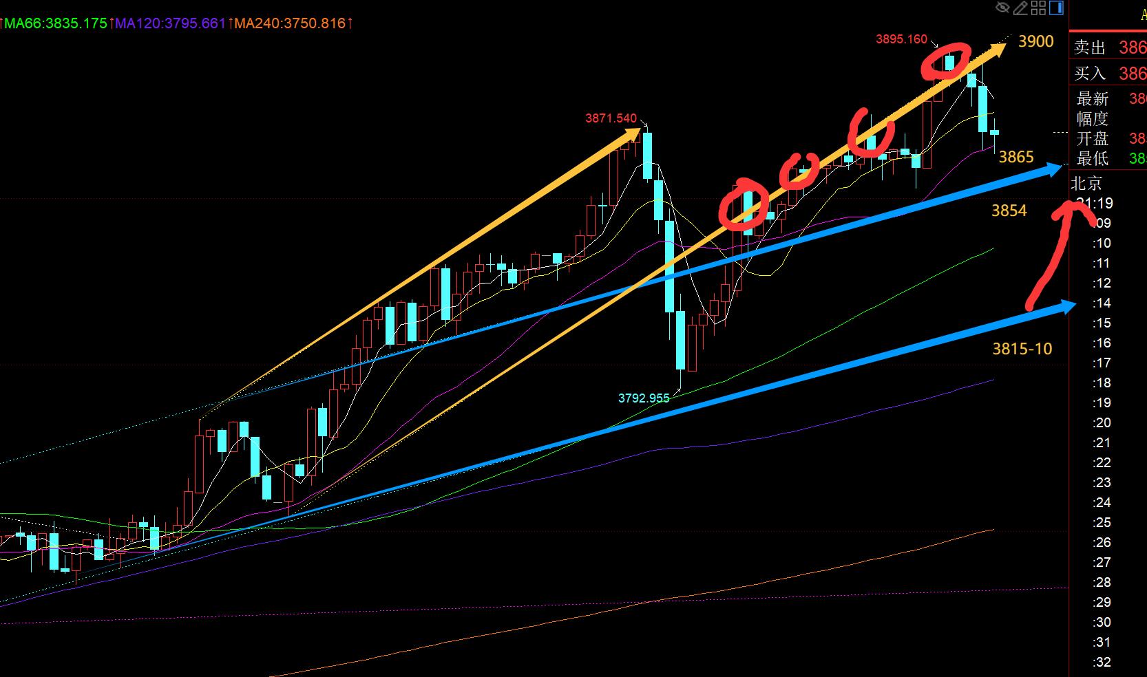 对于今晚来讲,个人倾向于耐心等靠近日线5均线3815-10上逢低再去把握一次不错的低位,此时留意中轨3865,和蓝色通道上轨支撑3854,一旦这两个位置接连失守的话,那基本又是多空的大幅度洗;若守住这两个支撑,就维持相对高位震荡运行;