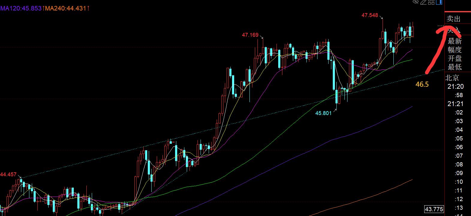 白银方面:同样,日线也未回踩5均线到位,直接发力一波上攻,趋势一直向上是没错的,就是日内最佳的看涨点不给机会;所以今晚也是看涨但不追涨了,期待给一个日线5均线的回踩机会去跟随趋势看涨,刺破也最好,拉的越低,修复一下,横盘整理一下,后期才能拉的更远;46.4-46.5支撑上看涨;