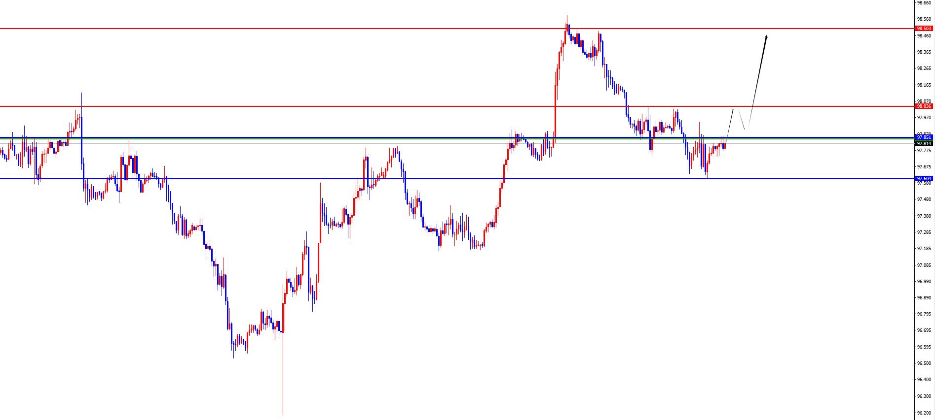 从多周期分析,周线级别来看近期价格在周线关键上下盘整,目前周线支撑于97.85区域,同时在上周价格站上周线阻力,后续看中期看多头延续。从日线级别看,随着时间的推移目前日线支撑于97.60区域,价格此位置之上波段进一步上涨。从四小时上看,目前看四小时阻力于97.60位置,昨日强调关注四小时分水岭能否站稳,随着时间的推移今日持续关注四小时站稳表现,站稳后继续看延续。