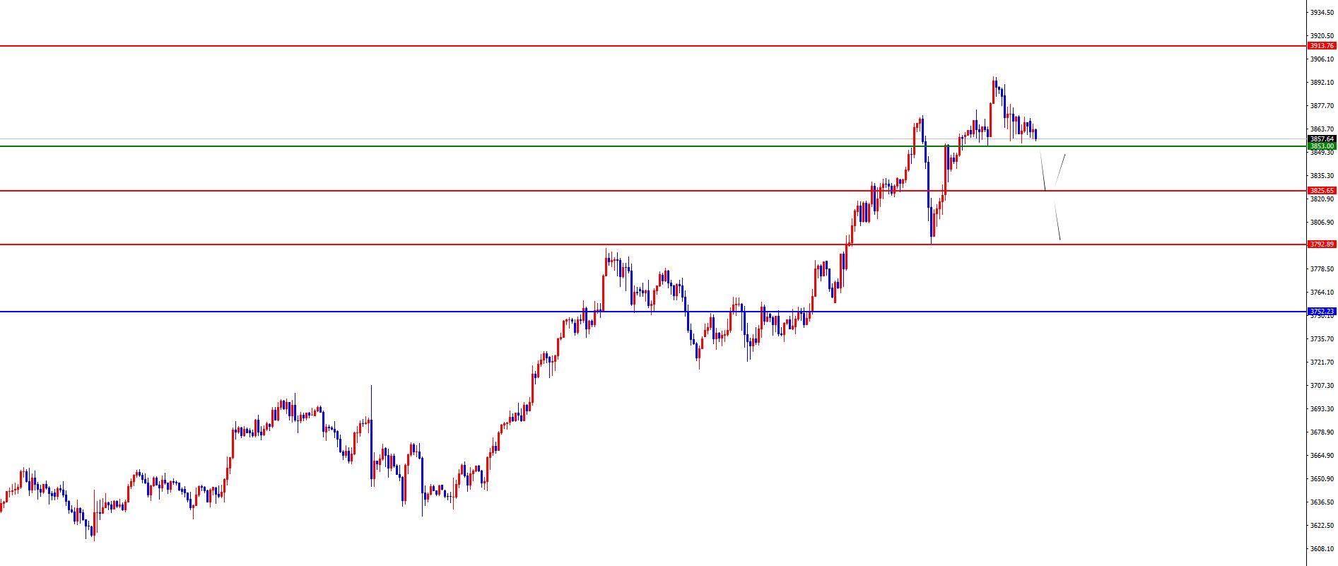 从多周期分析,首先观察月线节奏,从长线上看3130位置是长线走势的分水岭,价格在此位置之上长线多对待即可。从周线级别看,目前周线多空分水岭于3490位置,价格在此位置之上中线多对待即可。从日线级别看,暂时需要关注3752区域支撑,此位置之上波段多对待,目前继续右侧交易方式对待。从四小时上看,观察黄金上涨节奏中,近期上涨价格拉升170点左右后出现承压,从修正空间看几乎在70美金左右,从3716区域拉升至3895看已经超过170美金,如若按照回撤算的话在3825区域。目前四小时价格有下破3853短线分水岭的表现,一旦下破则关注进一步承压对待,在没有下破前谨慎布局。一小时上价格目前下跌同样还是延续中,所以后续关注下破后进一步延续表现。