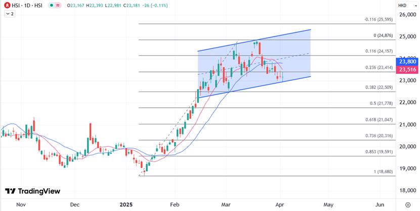 恒指首季累计狂飙3060点,累计涨15.3%,与国指双双成为全球表现最佳两大主要股市指数。进入新的季度暂时仍在寻找方向,技术上自3月下旬高位的调整仍在延续。今日港股午后继续好淡争持,市场关注美国今晚公布的关税措施的内容,当前市场整体情绪较为疲惫,因为政策具备高度不确定性,因此明日的港股开盘将跟随消息震荡,当前需要继续守住短期上行通道底部的关键支撑,也就是23000关口上方才能保留反弹倾向。
