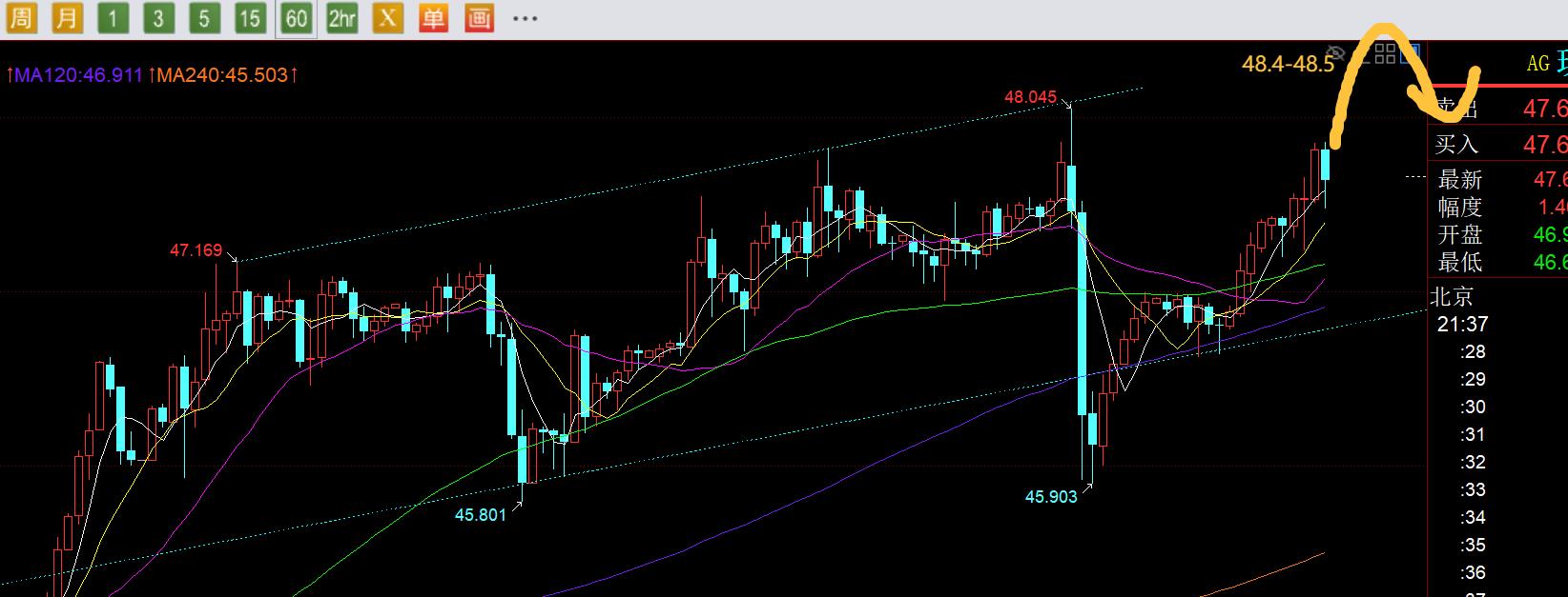 第二,白银方面:昨日白银并未布局,因为一直在外,也无法电脑上画图,不过也是强调小心逼空拉升之后,砸盘下跌,最终涨至48,瞬间跌至46,而48一线刚好是短期通道的上轨阻力位;