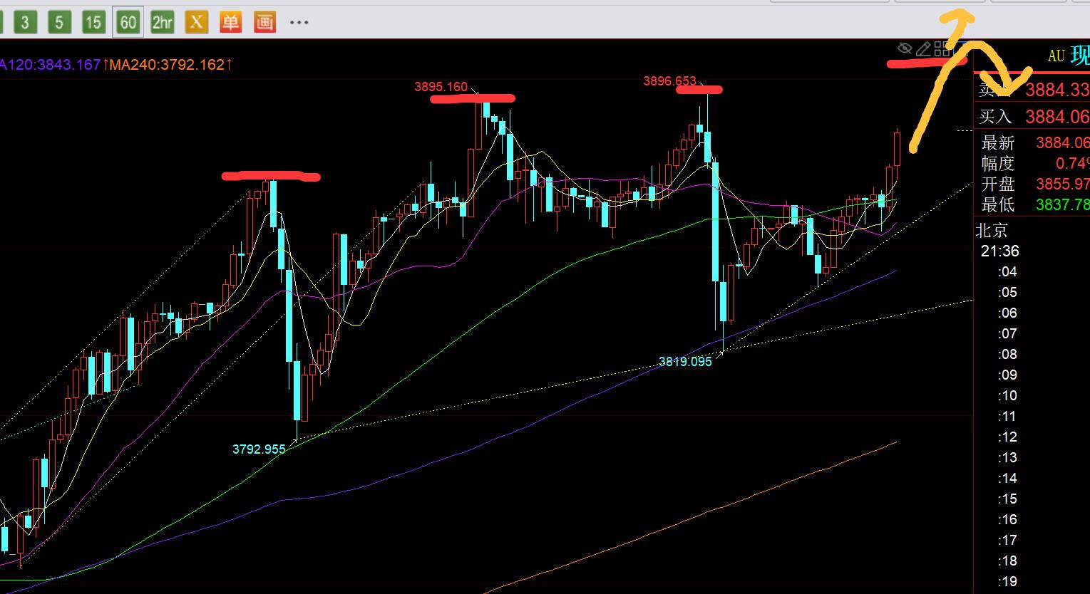 第三,黄金小时线级别:早间小幅先拉升触及中轨出现承压,当9点收报阴包阳之后,价格重新打回3858之下,就果断先跟随一波看跌回落,最终目标接近3837,它是处于隔夜反弹的618分割支撑;午后14点一根大阳又直接再次试探中轨,吞没前面阴K,就意味着下跌动能不足了,强调一旦重新收盘站上中轨,就需要跟随一波看涨。因此15点阳线的出现,就果断3860跟随看涨,当前涨至3880上;接下来就看今晚会不会再出现昨晚的多空杀套路,一路逼空至刺破昨日高点,再快速回测打压,所以3897突破之后,就要密切留意是否出现快速承压动作,形态则是长上影K,最好是阴线,那么就要小心承压回落;目前维持逼空拉升中,阻力3897之上谨慎追涨,它若不出现循环打压跳水,而是维持一路连阳走高,那么下周初基本要站稳3900而进一步强势单边发力,届时就继续强势博续涨;