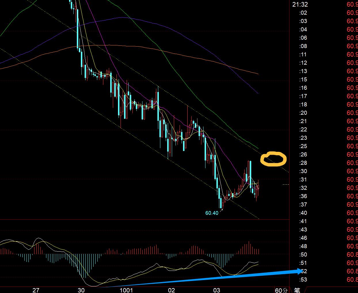 原油方面:虽然短期还是弱势下滑,但一直处于底背离,这种下跌或在酝酿后期的超跌反弹修正;通道下轨支撑关注60之上,阻力61.4上轨,什么时候有效突破上轨站稳了,那么超跌反弹也就启动了;