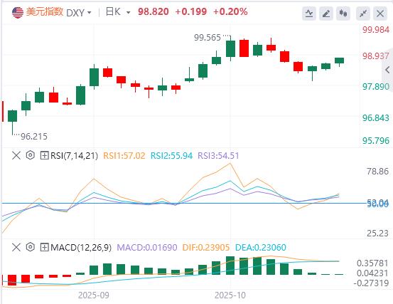 周一,美元指数维持震荡格局,最终小幅收涨0.06%,截至目前,美元报价98.82。