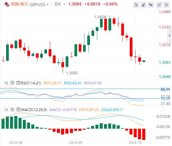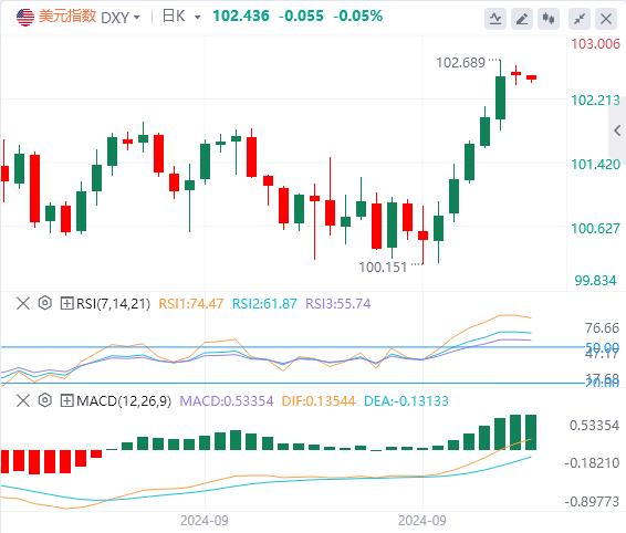 10月8日,北京时间周二亚市早盘,美元指数徘徊在102.43附近。周一,因交易员等待更多数据,美元指数在七周高位附近盘整,最终收涨0.01%,报102.49。基准的10年期美债收益率收报4.0330%;对货币政策更敏感的两年期美债收益率收报4.0040%。因市场对美联储降息幅度的预期减少,现货黄金延续回调,录得日线四连阴,盘中最低触及2637.71美元/盎司,最终收跌0.40%,报2642.63美元/盎司。现货白银最终收跌1.60%,报31.67美元/盎司。由于中东地区爆发广泛战争的风险增加,投资者解除上月积累的创纪录的看跌头寸,国际油价收高逾3%。WTI原油最终收涨3.84%,报77.25美元/桶;布伦特原油收涨3.89%,报81.09美元/桶,自8月以来首次突破每桶80美元。