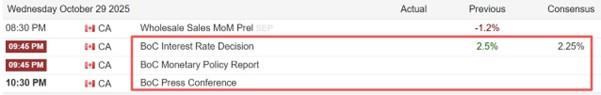 本周三21:45,加拿大央行将公布10月利率决议结果,主流预期认为其将降息25基点。加拿大经济发展严重依赖美国。今年以来,美国总统特朗普不断提高自加拿大进口商品的关税,叠加美国本身宏观经济有衰退迹象,加拿大经济的增长前景异常悲观。上周六,特朗普在社交媒体表示,将会对加拿大额外征收10%的关税,以报复其刊登批评美国关税政策的广告的行为。这将严重削弱市场人士持有加拿大元的信心。