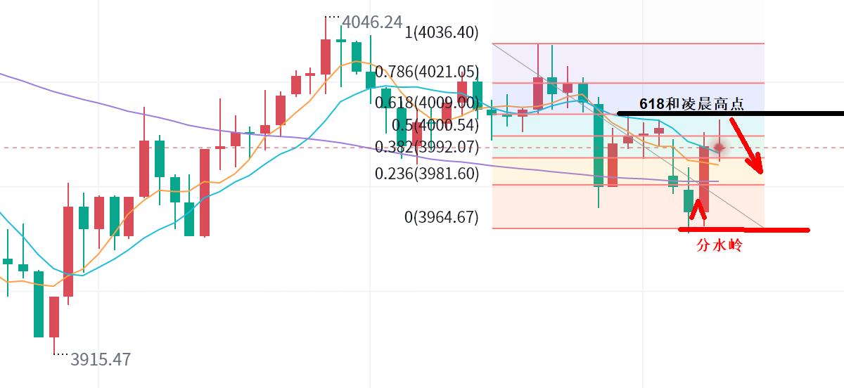 上方618位置4009,高点位置4037,欧盘如果一直在4009上方运行,那么晚上还要多。