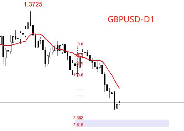 技术角度看,GBPUSD处于中期空头趋势之中,且10月中旬至今存在加速下跌迹象。图中MA10红色均线是比较可靠的阻力线,只要未来行情处于MA10均线下方,可以判定空头趋势仍在延续。根据黄金分割扩展线预测,下一阶段的支撑位可能出现在2.382~2.618分位附近,对应1.2880~1.2932点。