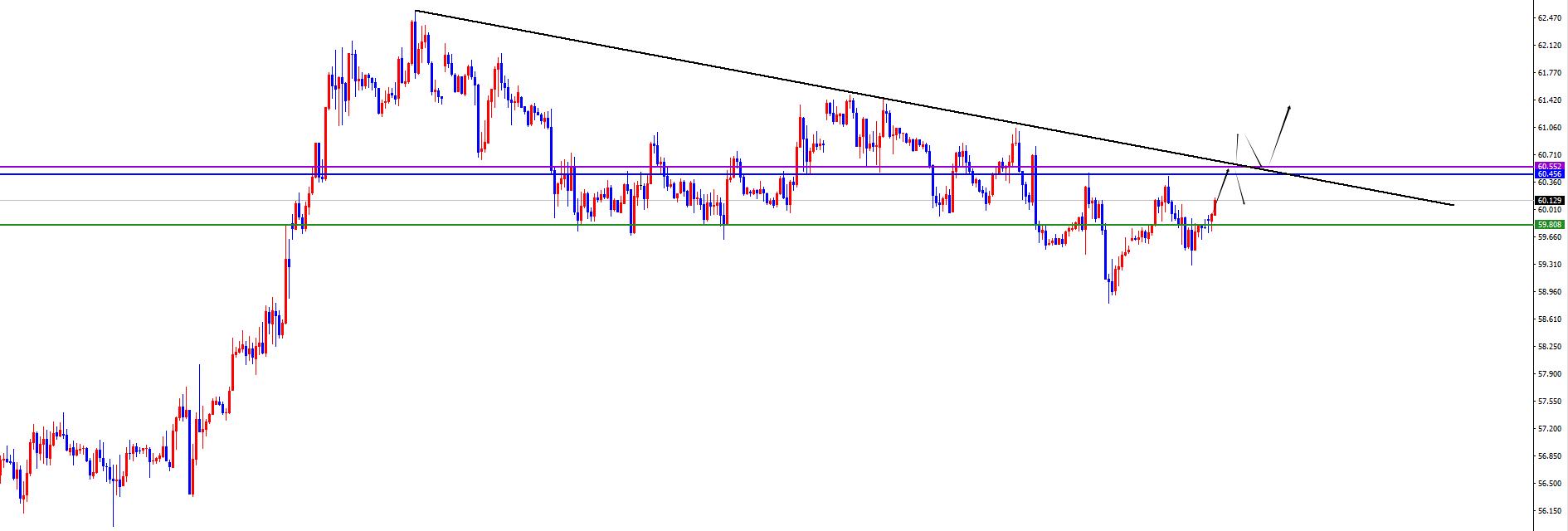 价格在59.80之上偏多,后续注意日线及周线阻力突破表现