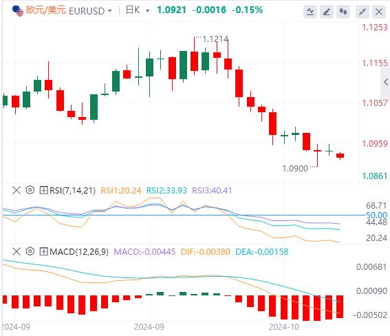 美元指数:截止发稿,美元指数交投于103.03附近。本周美国经济日历将会比较清淡,美国9月份零售销售数据将在周四公布;分析师预计环比增长0.3%,延续8月份的温和增长0.1%的趋势。市场有一个大致的估计范围,介于0.7%和0.0%之间。不包括汽车,核心零售销售预计将从8月份的0.1%增长0.2%,估计范围在0.4%和-0.2%之间。技术面上,多头将寻求将当前的涨势延续至104.59或更高至105.97。另一方面,空头将寻求在101.64左右或更低的100.19回调时猛攻。