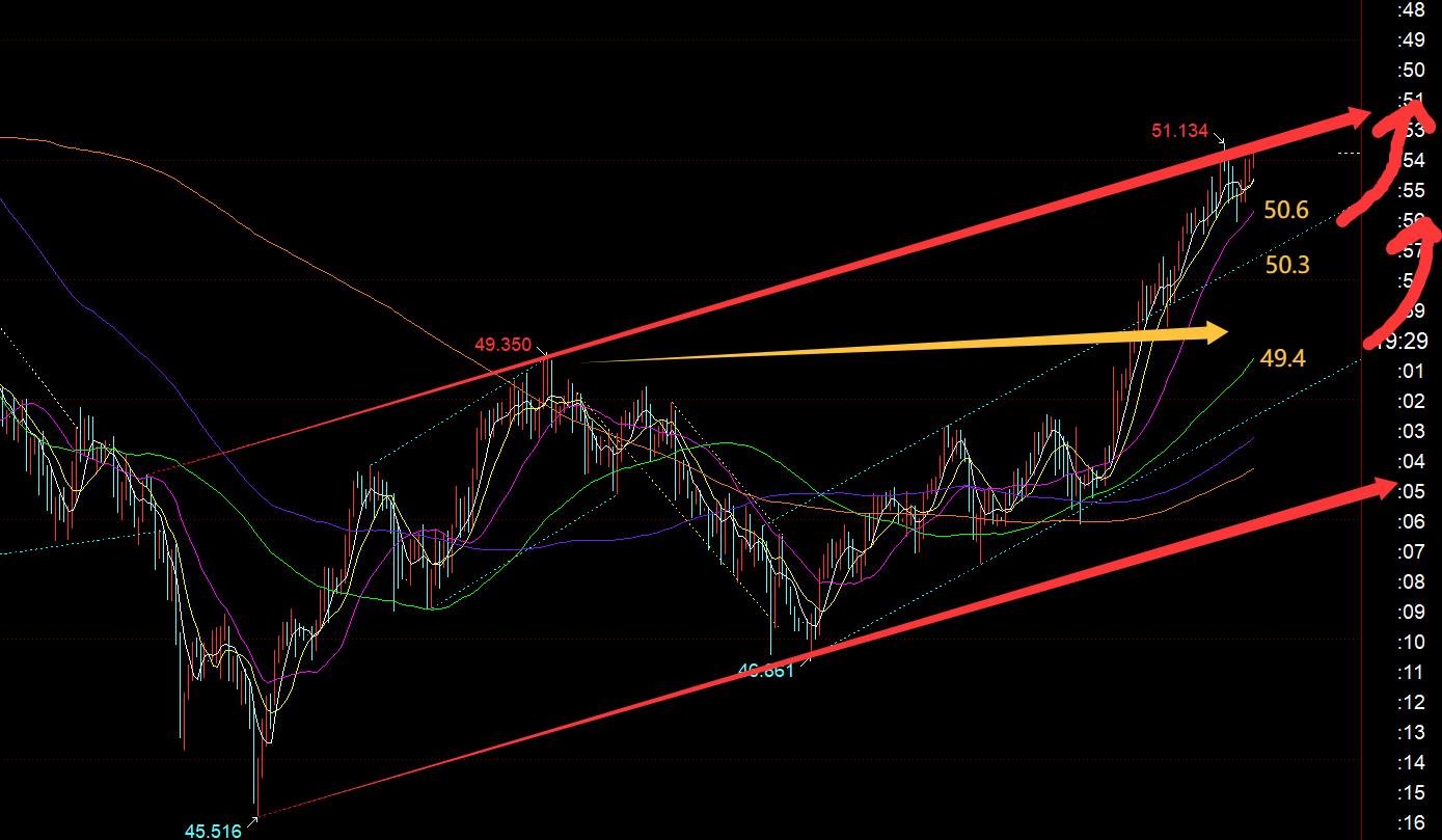 第二,白银方面:同样,周末计划48.2-48.1看涨,早间开盘直接拉升,也是踏空;美盘研报指出要强势维持,就不能失守49.65,也就是此位置上继续看涨,它是回踩试探到位了,但没去留意它,也是踏空;不过,周末预判的次高点51它已经到位了,属于618;