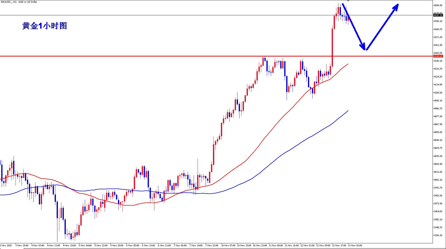 黄金1小时均线继续金叉向上的多头排列,黄金多头还有上涨力度,昨天我们也说了黄金短期震荡就是为了蓄势向上突破,黄金最近如期突破了4150-4160区域的阻力直接再次大涨触及4211一线。黄金现在短期4160已经由阻力转换成支撑,黄金早盘回踩4160直接继续逢低做多。
