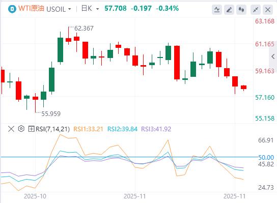 11月24日,北京时间周五亚市早盘,美元指数徘徊在100.28附近。上周五,尽管美联储“三把手”鸽派发言令12月降息预期有所回暖,但美元指数维持坚挺,盘中创近6个月新高,最终收跌0.056%,报100.17;美债收益率全线走低,基准的10年期美债收益最终收报4.068%,对美联储政策利率敏感的2年期美债收益率收报3.518%。现货黄金盘中跌超1%后一度转涨,但尾盘再度走弱,最终收跌0.28%,报4065.9美元/盎司,且录得本月来首次周度下跌;现货白银最终收跌1.13%,报50.04美元/盎司。在美国力促俄乌达成和平协议的拖累下,国际原油连续第三个交易日下跌。WTI原油跌至一个月低位,最终收跌1.31%,报57.92美元/桶;布伦特原油最终收跌1.17%,报61.93美元/桶。