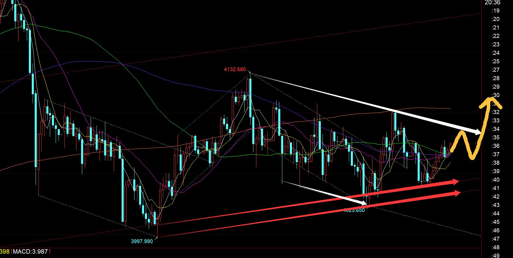 第三,黄金小时线级别:早间还是循环下跌,4101-4023的618分割支撑4053,或者收盘前4055支撑都未守住,向下直接试探了4040,它是上图红色通道下轨支撑,上周五也是围绕4030此通道下轨反复插针后企稳;午后及欧盘连阳V走高,再次试探了4077早间高点,双顶承压后回落至中轨进行试探确认;目前来看,中轨4066确认试探存在支撑,再次拉升反弹关注4077,一旦突破则留意白色趋势阻力线对应承压点,大概4086-90,突破它才能去试探4100-4110密集承压处;而作为震荡往复走法,提及的每一个目标阻力都或存在短线的承压回落,两步一回头,不是很干脆,需耐心等待;总体上,保持震荡看涨反弹为主;