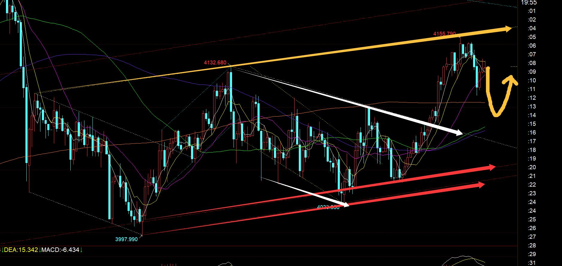 第二,黄金4小时级别:坚守年均线,每次都是插针式反弹拉升,今晚留意10均线和66日共振点4104一线支撑;