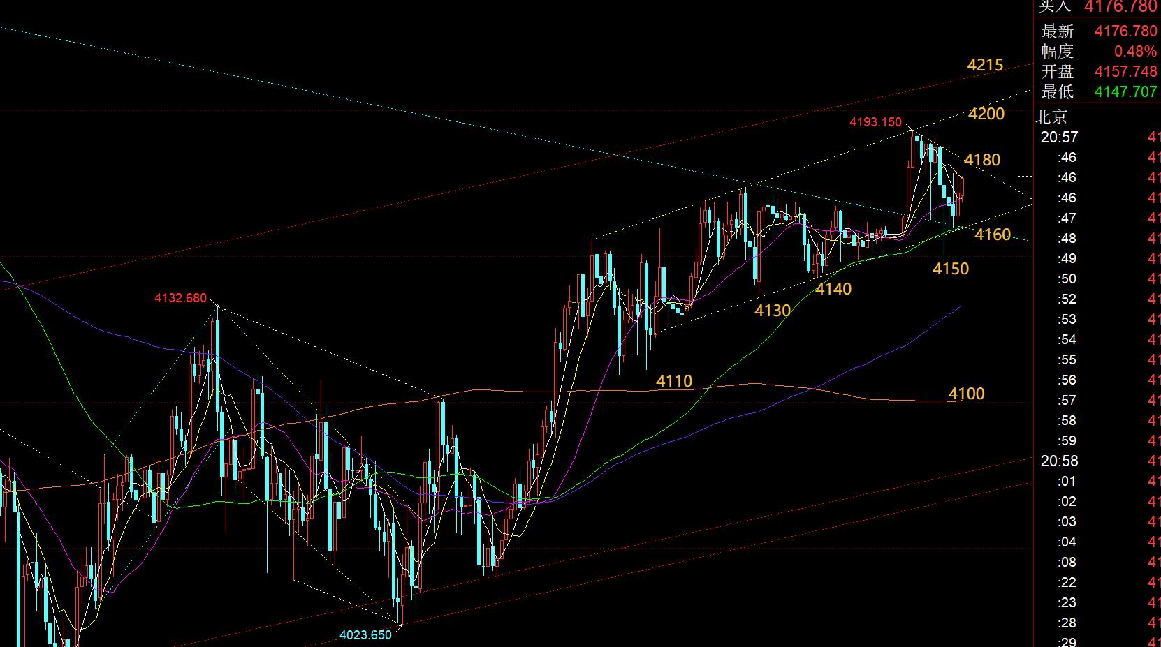 第一,黄金日线级别:今日早间黄金直接向上猛的冲击一波,最高4193,昨日研报提及,若向上先突破,则会去试探4192-4200,但延续性可能会差,仍会继续震荡,只是把小收敛三角进行扩大,升级为下一个大的收敛三角;或者,也有可能今日早上的上破是一个刺破,因为欧盘又向下跌破了早上低点4164,也就是跌到了小收敛三角上轨线上;所以,今天还是关注其收盘形态,如果冲高回落,收盘于4164之下,甚至5均线4150下,那么仍是处于小收敛三角内运行,下周初就会有震荡下滑动能和空间,不过4110-4100依旧有短期强支撑,稳定之后再去上破上轨,始终会走出小收敛三角,进行三角扩大;若参考4月8日走法,这一波从最后一次下轨4022启动,应该可以通过震荡式下滑+震荡式拉升,再去试探4245前一个高点,或刺穿它,然后冲高回落去试探小收敛三角下轨,或也来一个击穿,扩大运行范围,届时新的大收敛三角就会逐步定型出来;但不管怎么折腾宽幅整理,对于趋势多头始终不会改变,并且这次的盘整时间应该会短于上次4个月,再给它一个月时间看看后续走法,66日均线已经上移3925,大概率后市是很难破3900, 3885基本有望成为短期的低点;
