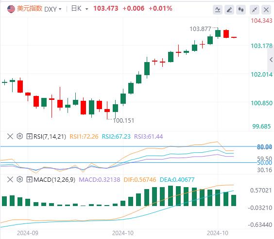 xn--xm-6d1dw86k.com10月21日,北京时间周一亚市早盘,美元指数徘徊在103.47附近。上周五,在连续五天上涨后,美元指数稍事喘息,但仍维持在103关口上方,最终收跌0.3%,报103.45。基准的10年期美债收益率收报4.0820%;对货币政策更敏感的两年期美债收益率收报3.9650%。受助于中东紧张局势升级、美国大选的不确定性以及对诸多发达国家央行的宽松货币政策预期,现货黄金续创历史新高,将历史高位刷新至2722美元/盎司,最终收涨1.08%,报2721.64美元/盎司。现货白银大涨6.41%,报33.72美元/盎司。因投资者消化喜忧参半的中东前景以及担忧全球需求前景,原油上周跌超7%,WTI原油在美盘时段加速下跌,最终收跌1.94%,报68.79美元/桶;布伦特原油收跌1.74%,报72.87美元/桶。