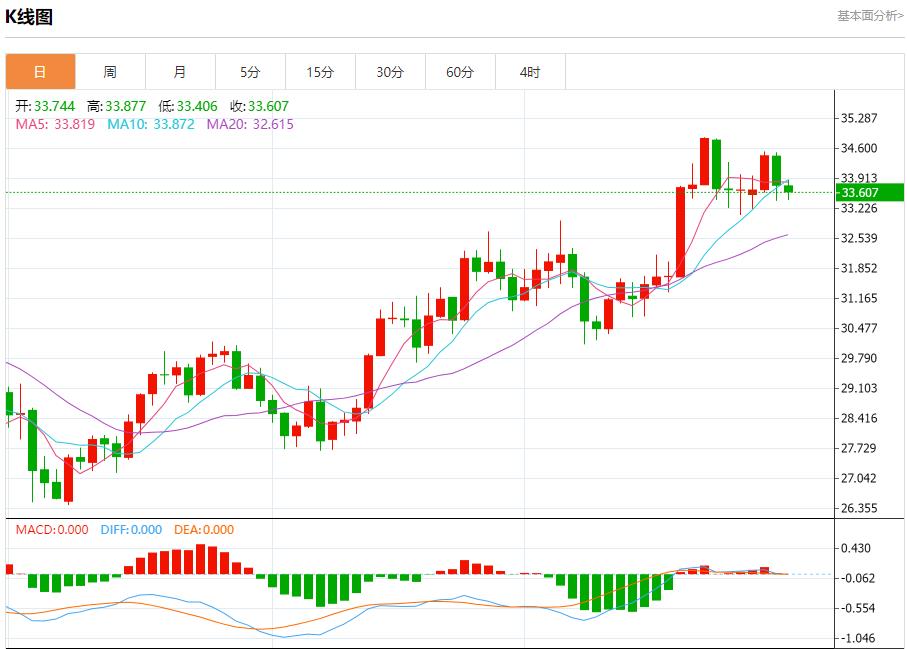 现货白银:截止北京时间20:23,现货白银下跌,现报33.605,跌幅0.47%。纽市盘前,白银价格提供了新的负面交易,以远离33.70美元的水平,并支持今天剩余时间继续看跌趋势的预期,等待访问33.04美元作为下一个主要目标,注意到突破它将直接推动价格走向32.50美元。