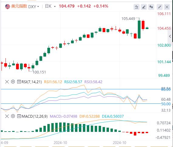 周四,由于鲍威尔没有提供任何强有力的线索表明未来可能暂停降息,以及投资者对“特朗普交易”进行获利了结,美元指数高位回落,截至目前,美元报价104.47。