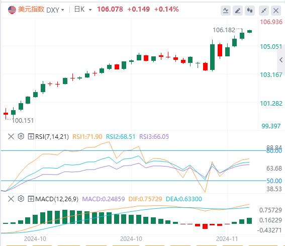 周二,美元指数延续涨势,盘中最高触及106.182,最终收涨0.404%,报105.93。截至目前,黄金报价106.078。