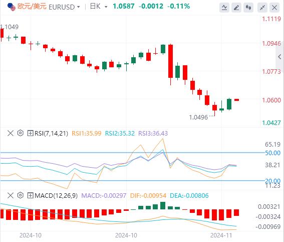 美元指数:截止发稿,美元指数徘徊在106.23附近。美元周一在相当高的水平上守住,本周开盘非常平静,衡量美元兑六种主要货币价值的美元指数在上周四触及的年内新高106.50上方附近略微下跌。周一货币的主要驱动力是拜登政府周日为乌克兰使用美国远程导弹瞄准俄罗斯境内的俄罗斯基础设施开了绿灯,就在本周一在里约热内卢举行的G20会议之前。技术面上,美元指数最近的支撑位位于106.00–106.15区间。跌破106.00水平将推动美元指数走向下一个支撑位104.60–104.80。