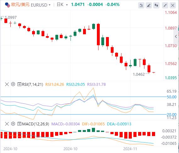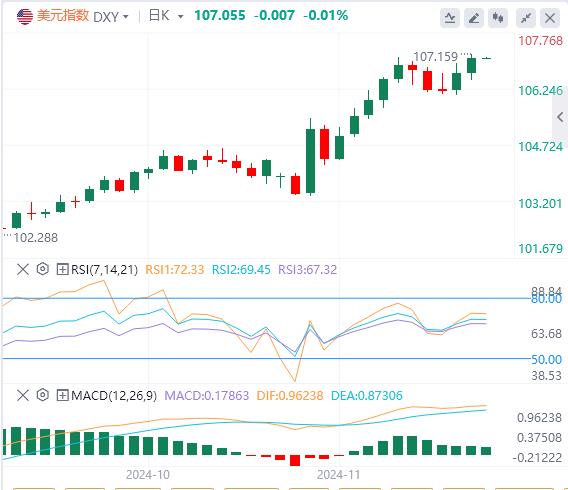 11月22日,北京时间周五亚市早盘,美元指数徘徊在107.05附近。周四,因市场预期美联储明年降息次数将减少,美元指数延续昨日涨势,最终收涨0.40%,报107.06。基准的10年期美债收益率收报4.4250%;对货币政策更敏感的两年期美债收益率收报4.3570%。乌克兰空军表示,俄罗斯对乌克兰发射了一枚洲际弹道导弹,俄乌局势再度升级,现货黄金连续第四个交易日上涨,最终收涨0.73%,报2669.37美元/盎司。现货白银几乎平收,最终收跌0.19%,报30.78美元/盎司。因市场担忧俄乌冲突升级影响原油供应,WTI原油最终收涨1.58%,报70.08美元/桶;布伦特原油收涨1.66%,报74.25美元/桶。