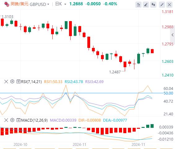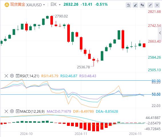 周一亚盘,黄金交投于2632.26附近。现货黄金震荡微跌,目前交投于2646.95美元/盎司。金价上周五小幅上涨,受美元下跌和持续的地缘政治紧张局势提振,但11月仍创下去年9月以来最大月跌幅,主要是特朗普胜选引发的后抛售。11月份,现货黄金下跌3.4%,这是自2023年9月以来最大月跌幅,原因是"特朗普兴奋情绪"在11月早些时候提振美元,阻滞了黄金的涨势,引发大选后抛售。下一个重要的美国经济数据将于周五公布,即11月就业报告。投资者将对美国经济的健康状况有新的看法,该报告可能有助于决定未来几个月的利率轨迹。
