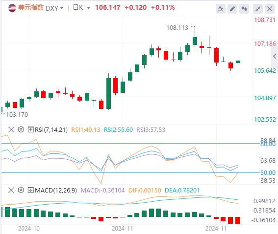 12月2日,北京时间周一亚市早盘,美元指数徘徊在106.14附近。上周五,美元指数延续下行之势,并失守106关口,最终收跌0.31%,报105.70。美债收益率有所下行,两年期美债收益率跌破4.2%关口,最终收报4.167%,10年期美债收益率同样跌破4.2%关口,收报4.174%。受美元下跌和持续的地缘政治紧张局势提振,现货黄金上周五有所回升,但11月仍创下自去年9月以来的最大月跌幅,最终收涨0.47%,报2650.34美元/盎司。现货白银最终收涨1.26%,报30.59美元/盎司。受压于对以色列-真主党冲突带来的供应风险的担忧缓解,以及2025年供应增加的前景,油价上周跌幅跌超3%。WTI原油上周五在68-69美元的区间内上蹿下跳,最终收跌1.06%,报68美元/桶;布伦特原油收跌0.85%,报72美元/桶。