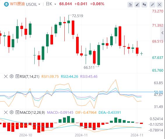 周一亚盘,原油交投68.05附近。周一亚盘,WTI原油徘徊于68.30附近,日内上涨0.43%。原油市场目前呈现看跌基调。供应风险缓解和2025年的悲观预测严重打压市场人气,但库存数据所反映的美国强劲需求可能会限制进一步的损失。未来几周的关键驱动因素包括地缘政治发展和12月OPEC+会议。目前,前景依然谨慎,下行风险占主导地位,但强劲的美国需求趋势可能提供支撑。