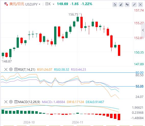 美元/日元在周四小幅上扬后,于周五亚市转跌,目前日内交投于10月底以来的最低水平150.00附近,日内跌幅约为1%。