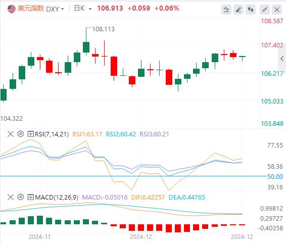 周一,美元指数在亚欧盘走高,在美盘陷入横盘震荡,截至目前,美元报价106.91。