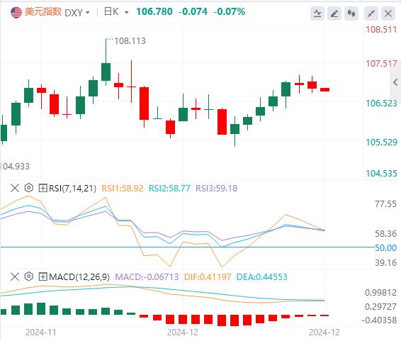 xn--xm-6d1dw86k.com12月16日,北京时间周一亚市早盘,美元指数徘徊在106.78附近。周一,美元指数高开后陷入横盘震荡,最终收跌0.082%,报106.85。美债收益率延续涨势,两年期美债收益率收报4.264%,10年期美债收益率收报4.405%。现货黄金总体上先涨后跌,盘中最高触及2664.36美元/盎司,随后抹去部分涨幅,最终收涨0.16%,报2652.73美元/盎司。现货白银最终收跌0.12%,报30.53美元/盎司。由于全球最大石油进口国消费者支出疲软,以及投资者在美联储利率决议公布前暂停买盘,两油从数周来的高点回落。WTI原油一度跌破70关口,最终收跌0.59%,报70.25美元/桶;布伦特原油收跌0.62%,报73.62美元/桶。