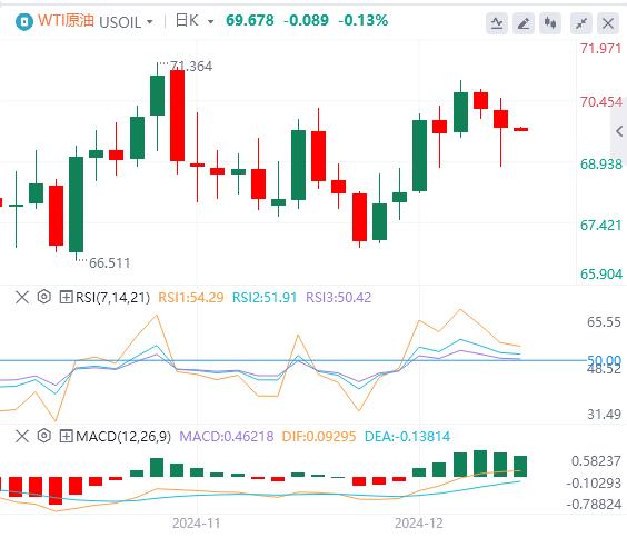 周三亚盘,原油交投69.67附近。由于对中国需求的担忧重燃,WTI油价震荡走低。在美国联邦储备委员会(美联储)周三公布利率决定之前,投资者保持谨慎。石油交易商在等待美联储周三召开今年最后一次政策会议。市场已经定价美联储将降息25个基点,但焦点将集中在美联储有关2025年和2026年利率政策的前瞻性指引上。若美联储释放宽松周期力度减弱的信号,都可能助推美元走强,打压以美元计价的大宗商品价格走低。