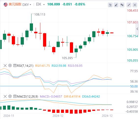 12月18日,北京时间周三亚市早盘,美元指数徘徊在106.89附近。周二,随着交易员等待美联储年内最后一次政策会议的结果,美元指数维持高位震荡,最终收涨0.088%,报106.95。美债收益率基本持平,盘中触及一个月来的高点,两年期美债收益率收报4.266%,10年期美债收益率收报4.403%。在美元走强和美债收益率保持强势的压力下,现货黄金震xn--xm-6d1dw86k.com荡下行,一度大跌20美元至一周新低,最终收跌0.23%,报2646.66美元/盎司。现货白银最终收涨0.03%,报30.54美元/盎司。由于全球最大石油消费国的经济数据引发需求担忧,两油连续第二个交易日走低。WTI原油一度跌超2%,最终跌幅收窄至0.65%,报69.79美元/桶;布伦特原油收跌0.77%,报73.05美元/桶。