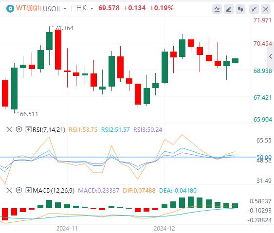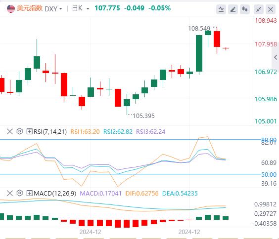 12月23日,北京时间周一亚市早盘,美元指数徘徊在107.77附近。上周五,由于美联储最爱的通胀指标降温令降息预期回温,美元指数从两年高位回落,最终收跌0.543%,报107.83,但仍连续第三周上涨。美债收益率全线走软,两年期美债收益率收报4.317%,10年期美债收益率收报4.519%。现货黄金在美国PCE数据公布后扩大涨幅,一度站上2630美元关口,随后有所回落,最终收涨1.01%,报2620.79美元/盎司。现货白银跟随黄金反弹,最终收涨1.62%,报29.51美元/盎司。受美元走软的支撑,加上特朗普要挟欧盟购买美国油气,国际原油盘中跌超1%后转涨。WTI原油最终收涨0.38%,报69.48美元/桶;布伦特原油收涨0.47%,报72.6https://xn--xm-6d1dw86k.com5美元/桶。