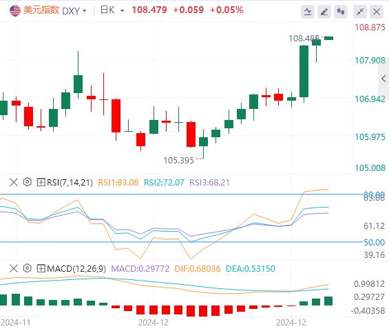 美元指数:截止发稿,美元指数徘徊在108.47附近。为期两天的联邦公开市场委员会(FOMC)会议以降息25个基点结束,但预计2025年降息幅度会减少,反映出持续的通胀和对未来政策举措的谨慎。技术面上,美元指数正试图收于阻力位108.30–108.50上方。如果这次尝试成功,美元指数将朝着下一个阻力位109.40–109.60前进。