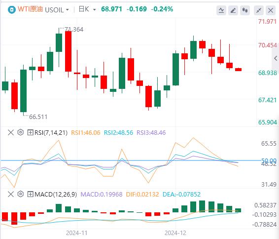 周五亚盘,原油交投69.97附近。油价下跌,此前美国和欧洲的中央银行官员对进一步宽松货币政策发出了谨慎信号,市场担忧疲弱的经济活动可能会削弱明年对石油的需求。美联储如预期于周三降息25个基点,但主席杰罗姆·鲍威尔(JeromePowell)警告称,顽固的通胀将使美联储在明年更加谨慎地采取降息措施。美元升至两年来的最高点,使得持有其他货币的买家购买石油的成本增加。