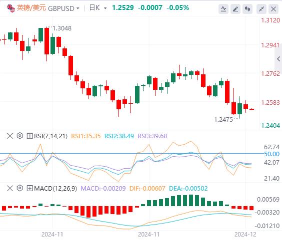 美元指数:截止发稿,美元指数徘徊在108.15附近。美元指数周一上涨0.4%,徘徊在两年高位附近,美元指数在五个交易日中第四日上涨,此间已累计上涨1.2%,降低了黄金对其他货币持有者的吸引力。交易员预计明年美联储将降息33个基点,表明他们认为美联储第二次降息25个基点的可能性不到50%,低于美联储上周预测的两次幅度为25个基点的降息。美联储决策者上周将2025年的降息预期从100个基点下调至50个基点,并上调了通胀预期。技术面上,美元指数最近的阻力位位于108.30–108.50区间。突破108.50水平将推动美元指数走向下一个阻力位109.40–109.60。
