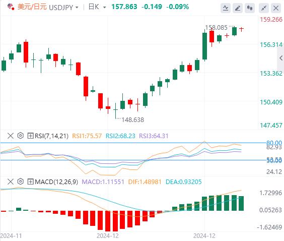 美元/日元周四晚些时候触及158.00上方的7月中旬以来最高水平,随后进入盘整阶段。截至发稿时,该货币对处于下跌之中,报157.70附近。