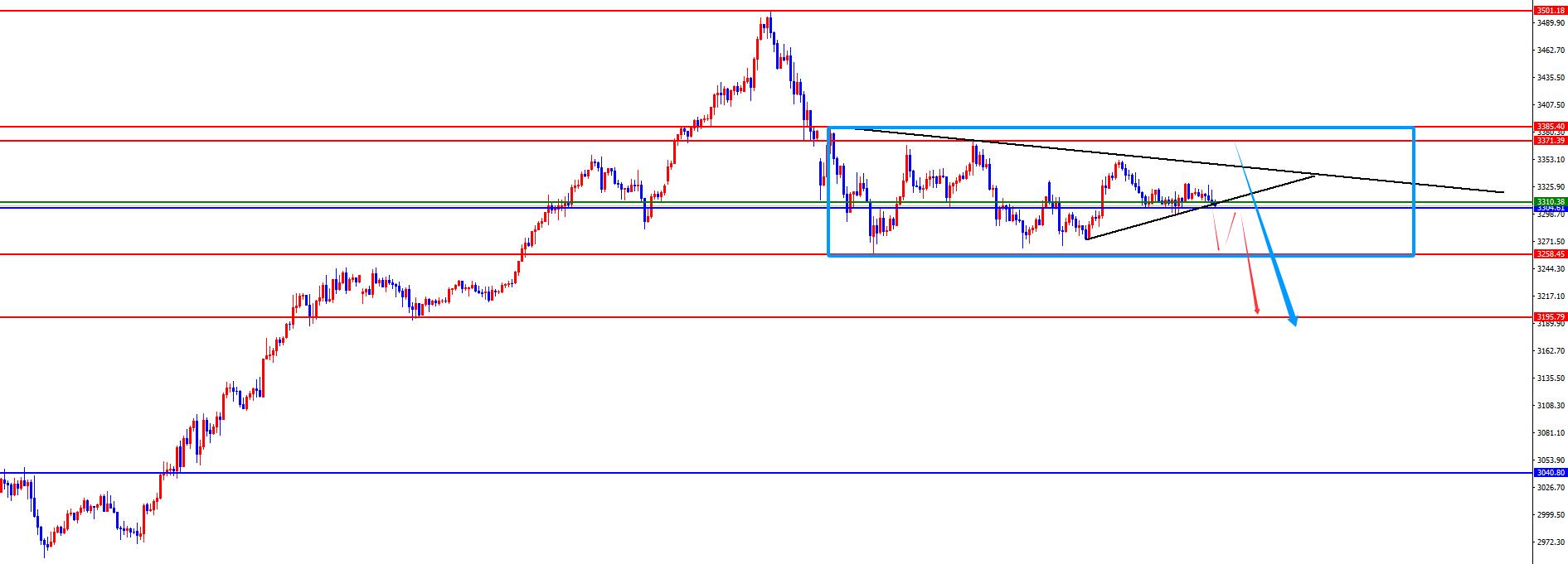 黃金3370-3371區間空,防守3390,目標3260-3200(如若先下破日線支撐3304位置則後續需要關注延續)