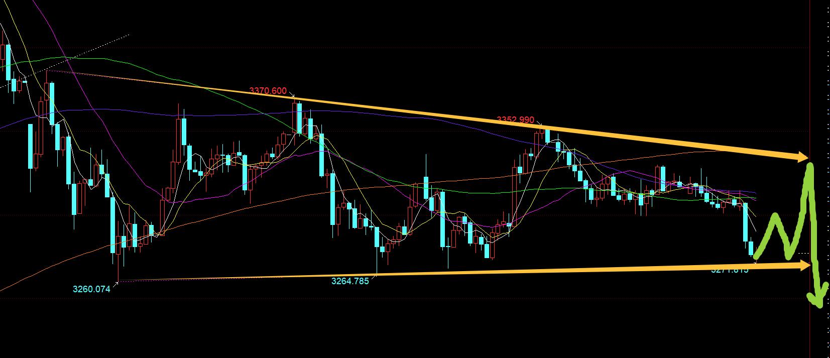 第二,黃金4小時級別:昨日幾乎一天徘徊於中軌一線,18點收報一根大陰算有效失守中軌,今晚反彈確認的壓力位就是3300一線,頂底位置,也是中軌反壓點,再往上就是66日均線3330一線,支撐很明顯就是3270-3260看得失;