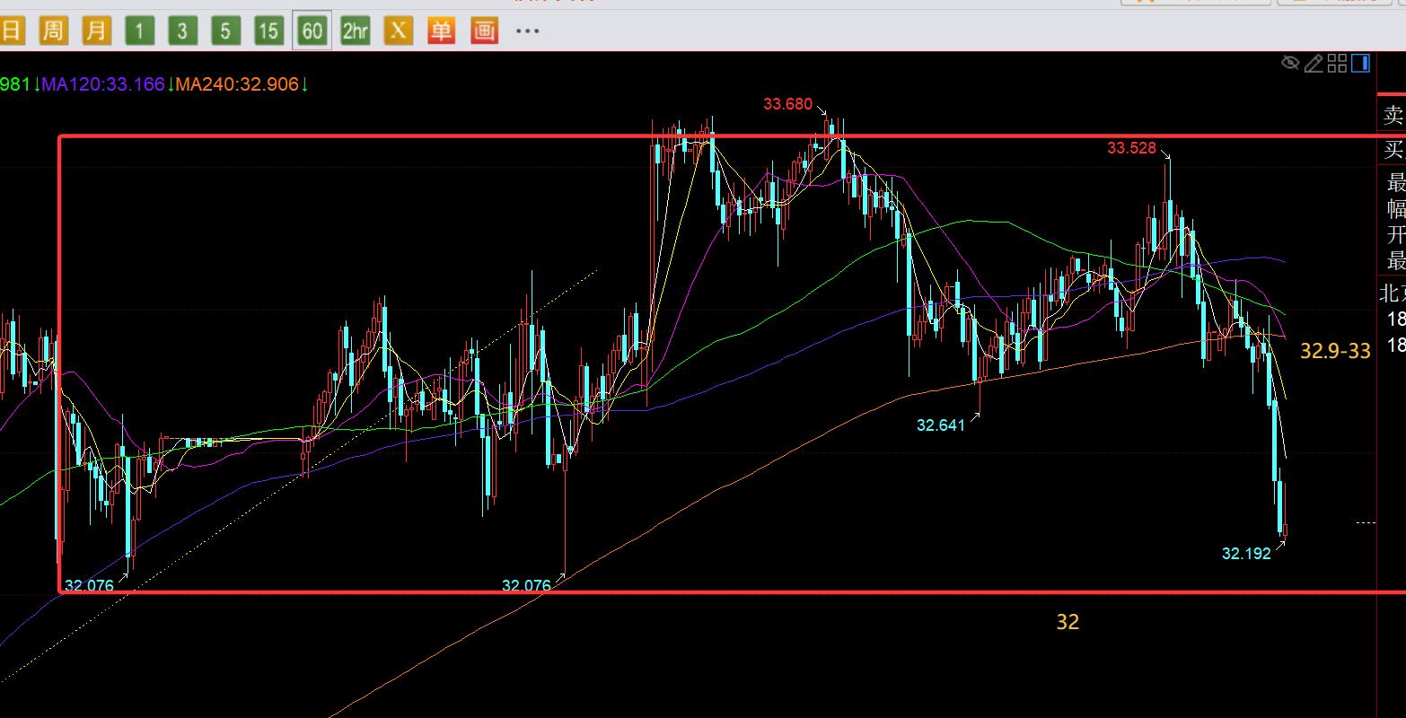 白銀方面:白銀目前也是維持箱體整理,關鍵支撐32,今日下破了小時線年均線,那麼32.9-33下會成為反壓,留意此區間內震盪對待;