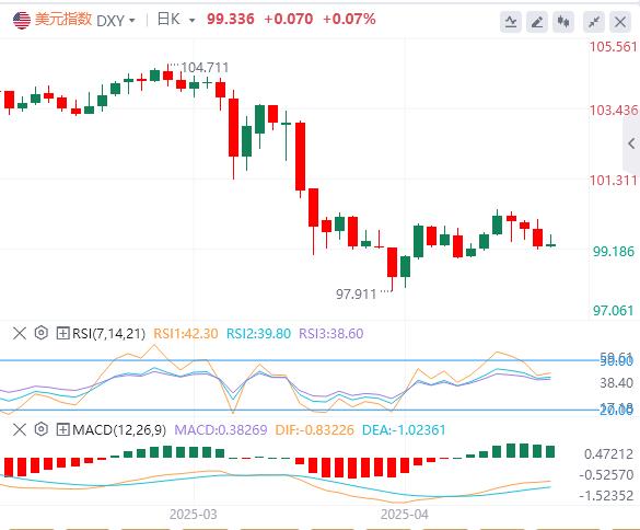 週二,因美國3月貿易逆差擴大至創紀錄的1405億美元,美元指數全日震盪下行,截至目前,美元報價99.33。