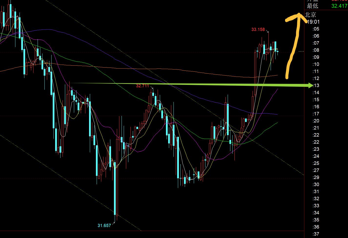 白銀方面:32.7頂底阻力已經突破,下行通道也突破,今晚依托32.7之上嘗試看漲,阻力33.5一線;