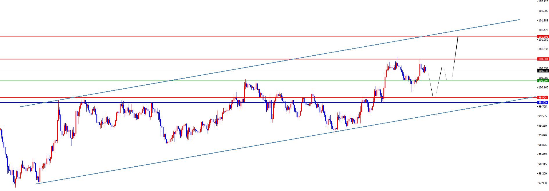 從多周期分析,週線級別來看價格壓制在102.80區域阻力,那麼從中期視角出發,美元指數的走勢將更偏向於空頭。在日線級別上價格站上99.80位置,則整體按照波段多頭看待,後續重點關注日線波段上漲後關注週線阻力得失。同時按照四小時級別看,價格在昨日依托四小時支撐進一步上漲,目前四小時支撐於100.30區域。短線一小時上美指目前短線有調整的表現,同時上週五收盤結合看,所以今日日內重點關注99.80-90區間支撐,待後續價格到位後再關注進一步上漲,上方後續關注100.80-101.30區域。