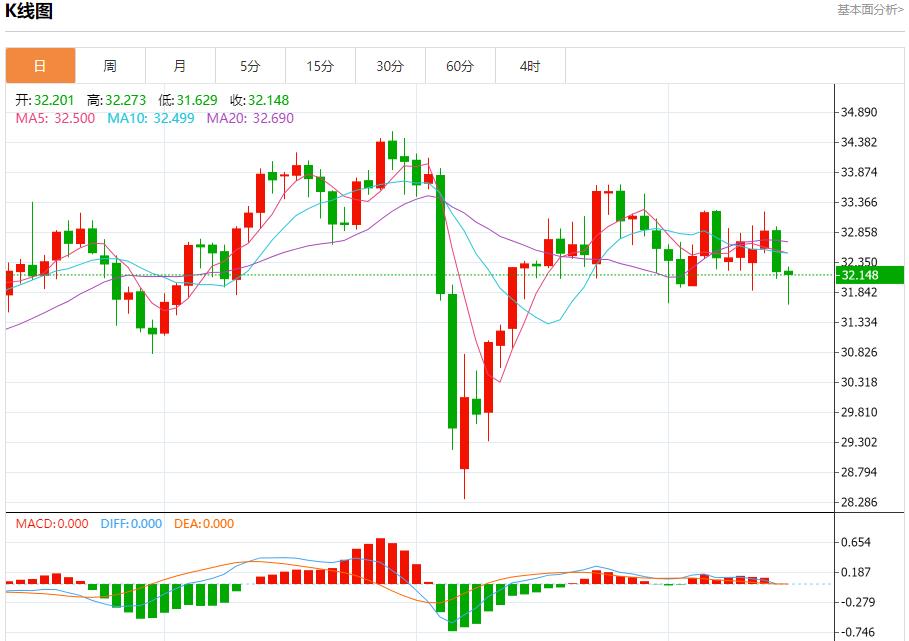 現貨白銀:截止北京時間20:24,現貨白銀下跌,現報32.136,跌幅0.18%。紐市盤前,(白銀)價格在超過31.90美元的關鍵支撐後,在日內水平上見證了混合交易,反彈走高,試圖擺脫其在(RSI)上誇大的超賣狀況,特別是隨著積極重疊信號的出現,以及試圖收復部分先前的損失,繼續承受來自EMA50下方交易的負面壓力。